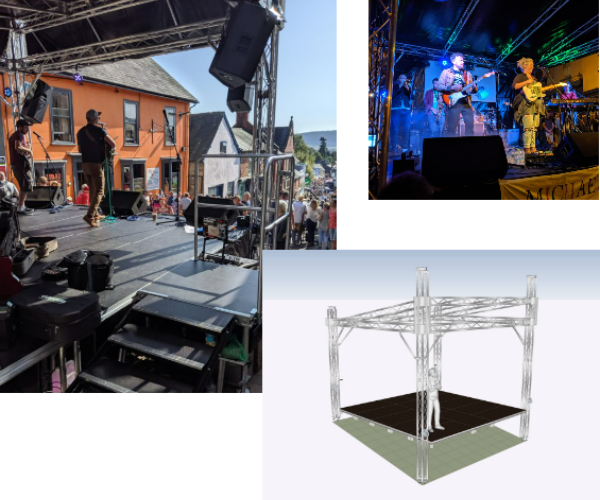 Compact professional live music stage system for use at the annual Michaelmas Fair and other public events.