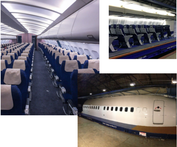 For the ultimate in flexibility and cost savings for interior based filming requirements, the company has complete 45ft sections of a modern Boeing midsize airliner, divided into left and right halves, which are fully customisable and modular for ease of filming. These are built into converted shipping containers making transport and location a much more convenient prospect than using a real aircraft of that type.
